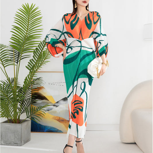 Women'S Temperament Pleated Print Batwing Sleeve Dress